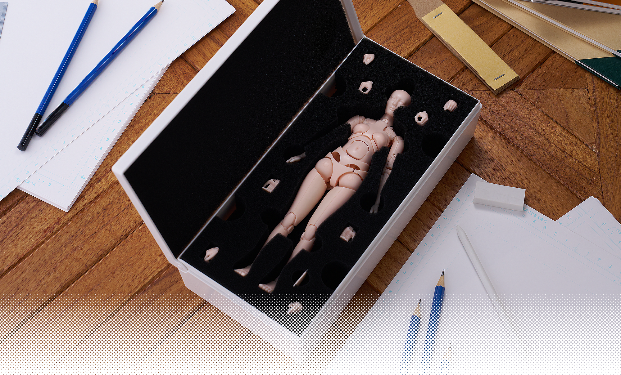 「若有一個『理想的素描人偶』,能自然且自由擺出任何動作,是否就能更輕鬆、明確地描繪出人物插畫呢?」由開發者西村懷著這樣的想法,因此誕生了本商品「西村式素描人偶」。